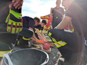 Unsere Aufgabe für Feuerwehr: die Rettung vermisster Personen aus dem Wasser. Dabei mussten die Feuerwehrleute mit unserem Raft (ein aufblasbares Rettungsboot) aufs Wasser – allerdings stand ihnen nur ein einziges Paddel zur Verfügung. Die besondere Herausforderung bestand also darin, sich kreativ zusätzliche Paddel aus Alltagsgegenständen wie Latten, Bändseln oder sogar Bratpfannen zu bauen. Anschließend galt es, die Geretteten an Land zu bringen und fachgerecht eine Herz-Lungen-Wiederbelebung durchzuführen. Zwischendurch warteten noch kleine Knotenrätsel, die bei richtiger Lösung Extrapunkte brachten.