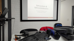 Im Hallenbad Weiterstadt ging es mit Flossen ins Wasser. Geübt wurden Strecken- und Tieftauchen, das Anleiten von Schnorchelübungen sowie die kombinierte Rettungsübung mit anschließender Herz-Lungen-Wiederbelebung.